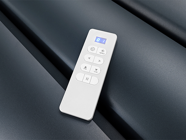 Il telecomando è dotato di pulsanti e canali indipendenti per il controllo di più dispositivi. Rende l'utilizzo della pergola estremamente semplice e pratico: tutte le funzioni possono essere controllate da un unico dispositivo intuitivo, semplificando notevolmente l'uso quotidiano.